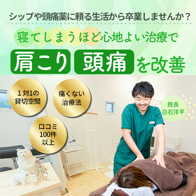 「肩こりには肩を押す」、「腰痛には腰を押す」。そのようなイメージはないでしょうか?当院ではそのような治療はおこないません。なぜなら、原因は患部にはないから。頭痛に関しても同じことが言えます。頭痛の本当の引き金となっている部分にアプローチすることで、最短で痛みの改善が可能となり、結果的に頭痛薬を服用する生活からも卒業できます。ぜひ、当院でしか受けることのできない頭痛療法をお試しください。