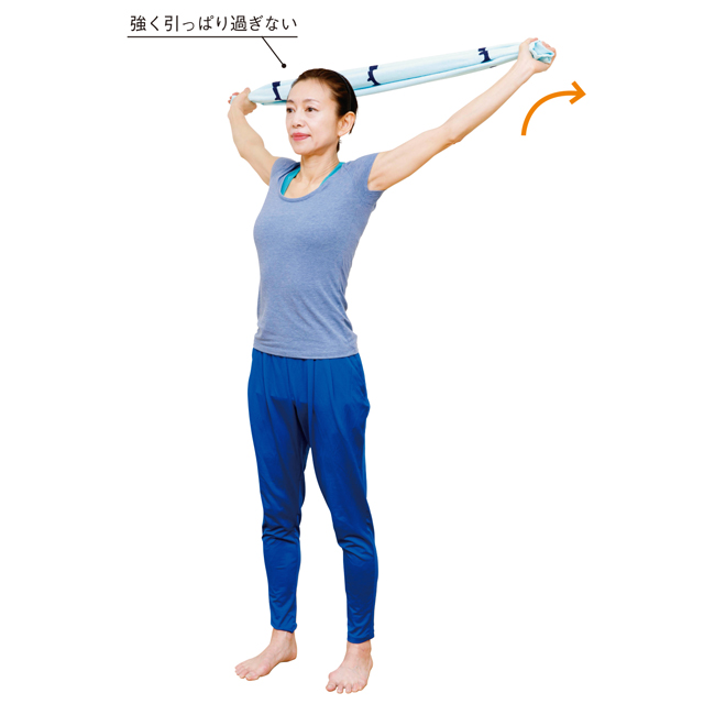 両手でタオルを持って上に上げる「タオルストレッチ」は、肩甲骨周りの柔軟性を高め、肩こりや猫背を解消する効果的な運動です。タオルを肩幅より広く持ち、呼吸に合わせてゆっくりと上下や左右に動かすことで、上半身の血行が良くなります!痛くない程度に、1回20秒程度伸ばしましょう!